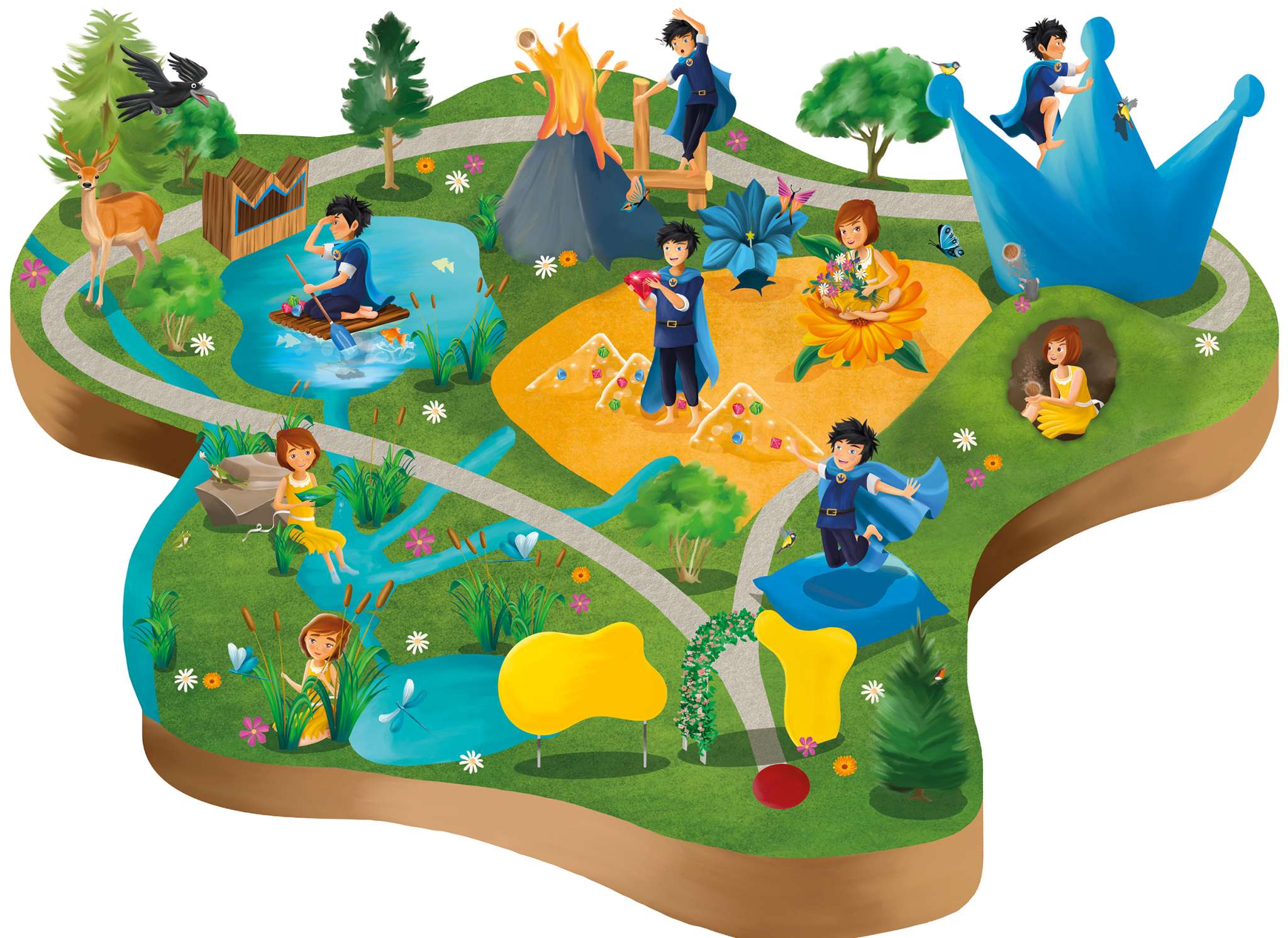 9 stations d'aventure avec des énigmes et beaucoup d'informations sur les plantes et les animaux ainsi qu'un parc à boules ne demandent qu'à être découverts par toi. Une couronne d'escalade, un monde aquatique avec des radeaux, des jeux d'eau et un étang de koïs t'invitent à de nouvelles aventures. Ou alors, tu peux faire des envolées insoupçonnées sur le trampoline géant.